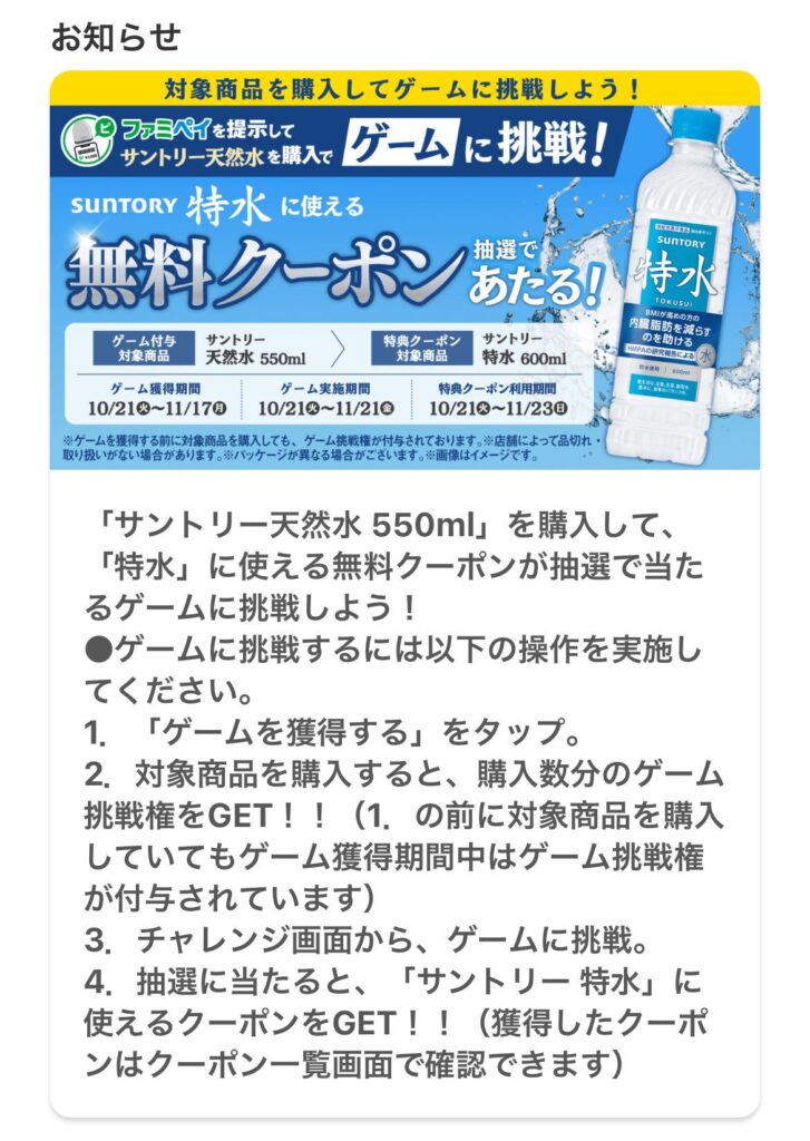 ②ファミペイ提示で特水の抽選権利がもらえる(ファミペイ支払いでなくても掲示しバーコードを読み取ってもらえばOK)