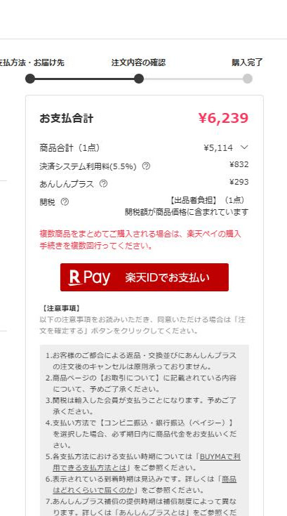 商品価格以外に決済システム利用料(5.5%)と、あんしんプラス(サイズが異なった場合返却でサービス)の料金がかかりました^^;