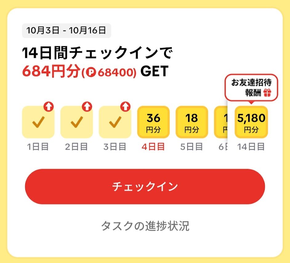 03のチェックインタスクは同じ「ギフト」ページの「新規ユーザー限定タスク」セクションに表示されます。