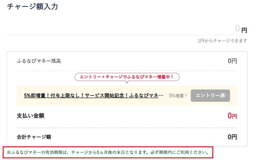 ただし、ふるなびマネーの有効期限はチャージから5ヶ月後の末日までになるのでその期限内に利用する必要があります。