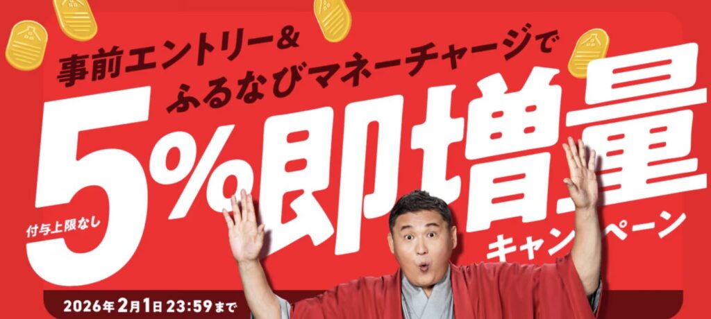 ふるなびキャンペーンで、2月1日までにチャージすれば5%増量になります。