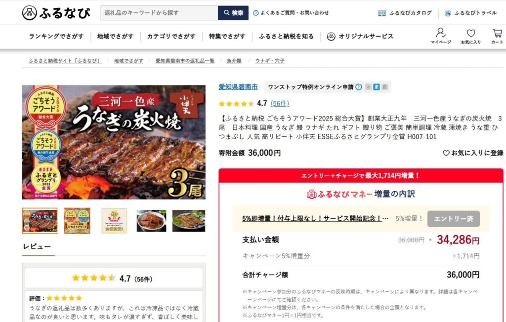 例えばこちらのうなぎの炭火焼きを注文する場合、本来3万6000円ですがキャンペーン5%で1,714円引きで購入することができます。