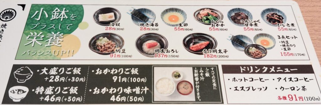 定食には、ご飯・お味噌汁・お漬物がついてます。小鉢がリーズナブルだったので、おくらおかかとこんにゃくの甘辛煮を追加しました!